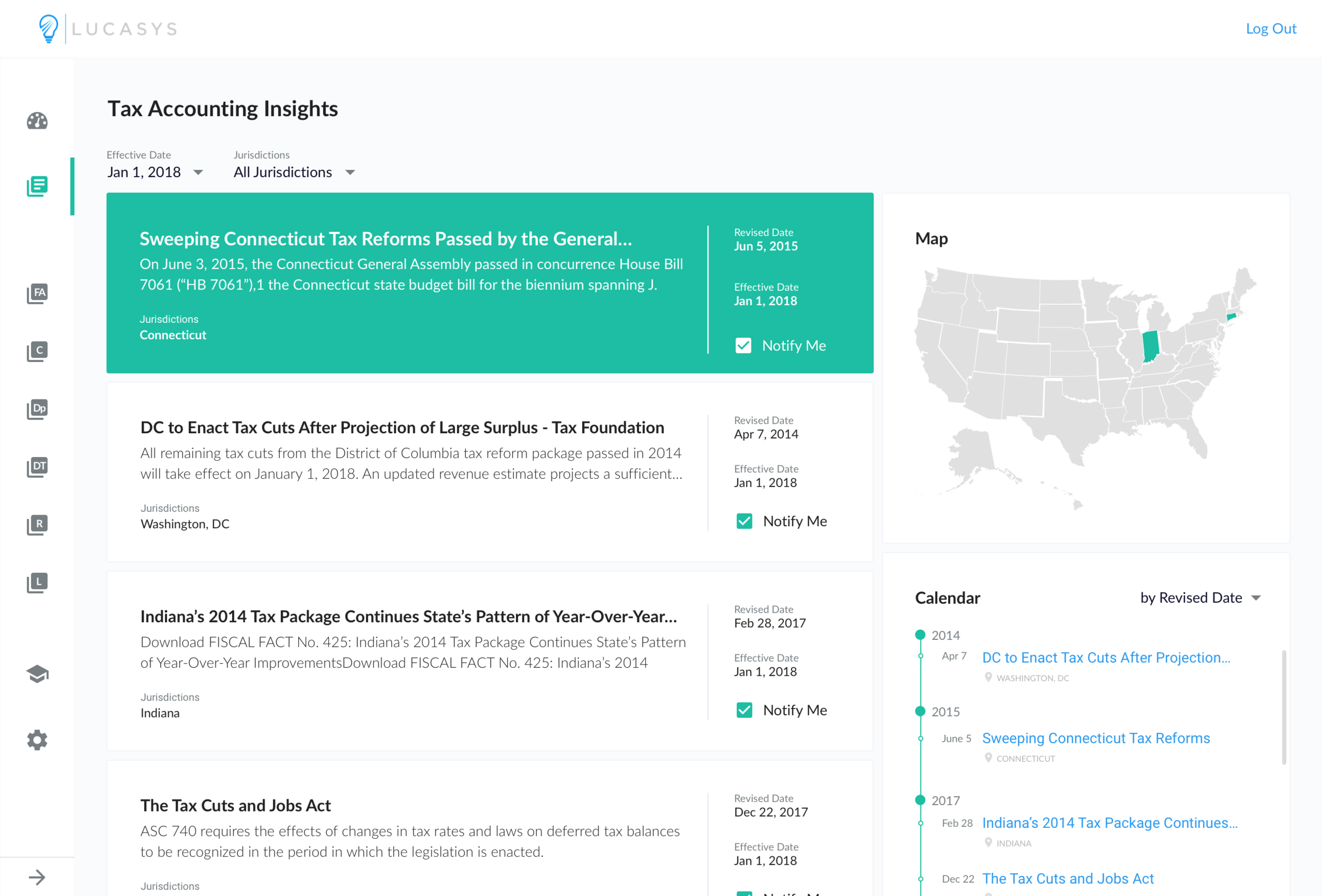 Lucasys software products come with the embedded intelligence you need to run your department. By aggregating industry-specific content from government agencies, regulatory bodies, trade organizations, and accounting firms, Lucasys offers a one-stop shop for your operating needs. With Lucasys software, get notified about proposed, pending, and enacted regulatory and legislative changes so that your people and your systems can be prepared.